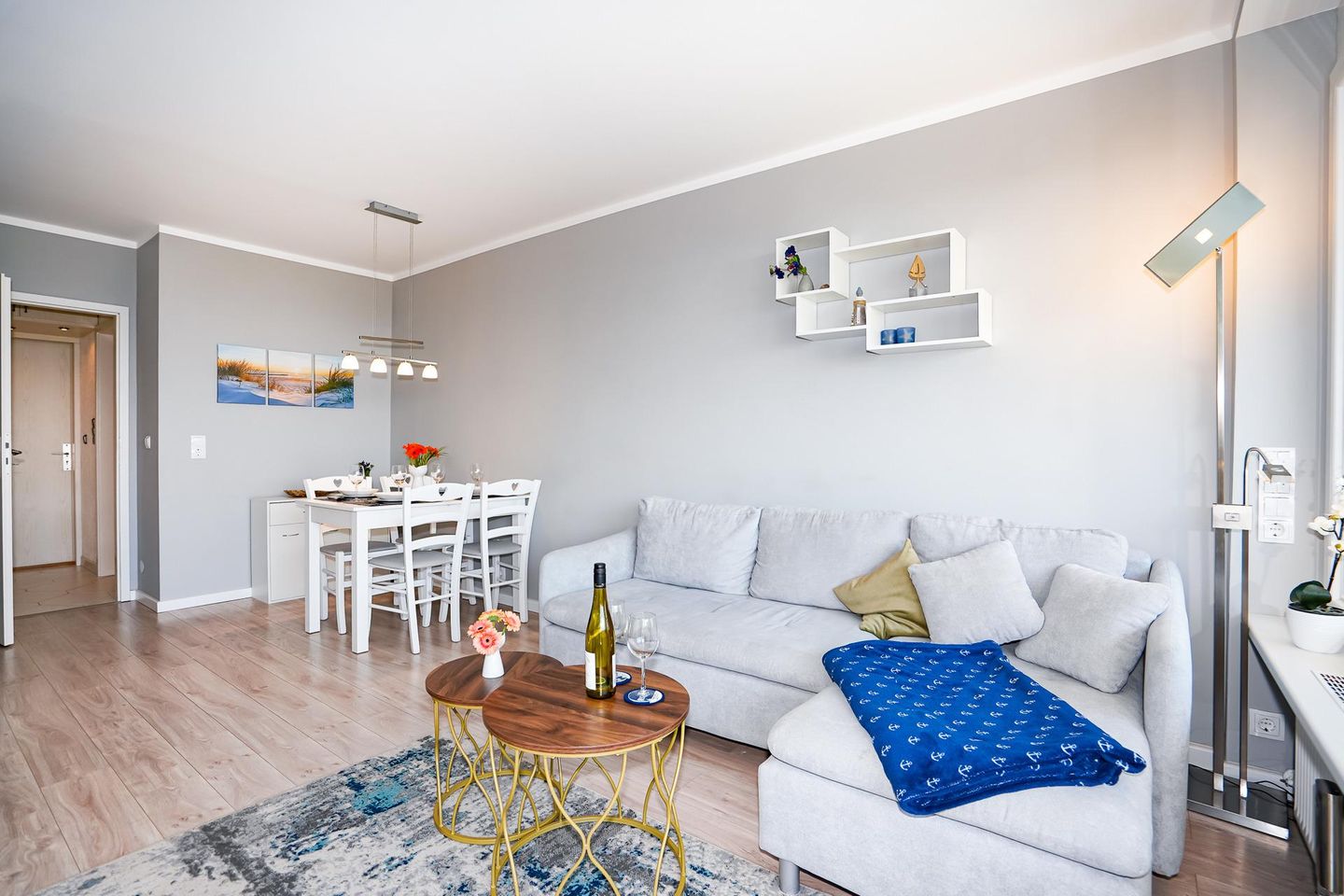 Das gepflegte und ruhig gelegene Apartment hat eine Größe von etwa 40 Quadratmetern und bietet bis zu 4 Urlaubsgästen Platz. Der Wohnraum verfügt über einen Essbereich sowie über eine bequeme Polsterlandschaft, von der aus die Lieblingsserie auf einem großen Flachbildfernseher verfolgt werden. Das helle Schlafzimmer ist mit einem bequemen Doppelbett (2 x 80 x200) ausgestattet. Die moderne Küche gibt Gelegenheit, eigene Mahlzeiten zuzubereiten. Das Badezimmer ist mit einer Dusche ausgestattet. Der mit wetterfesten Gartenmöbeln versehene Balkon bietet neben der Möglichkeit im Freien zu Frühstücken auch eine Aussicht auf die Lübecker Bucht. Eine Balkonverglasung lädt auch im Winter zum verweilen auf dem Balkon ein.