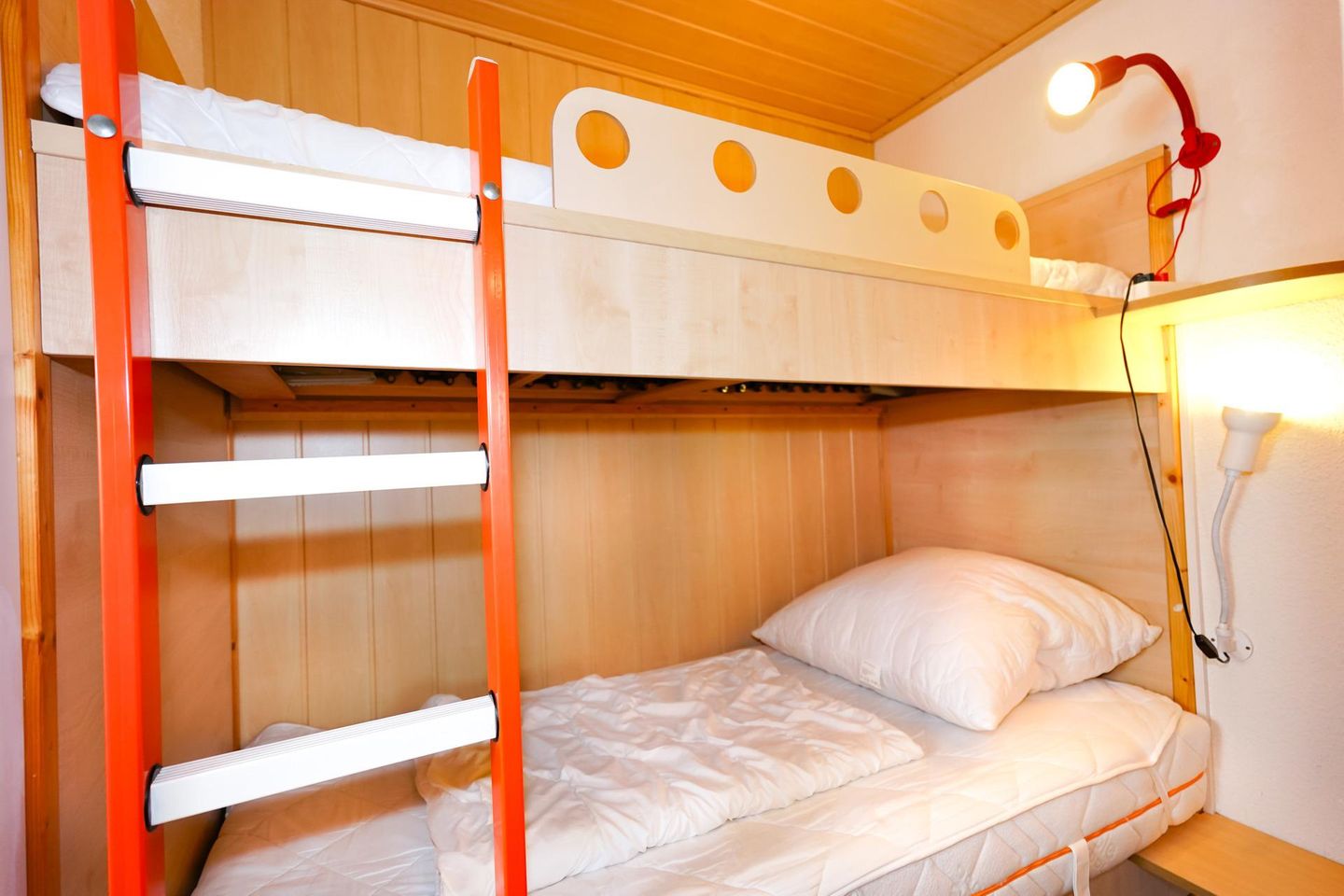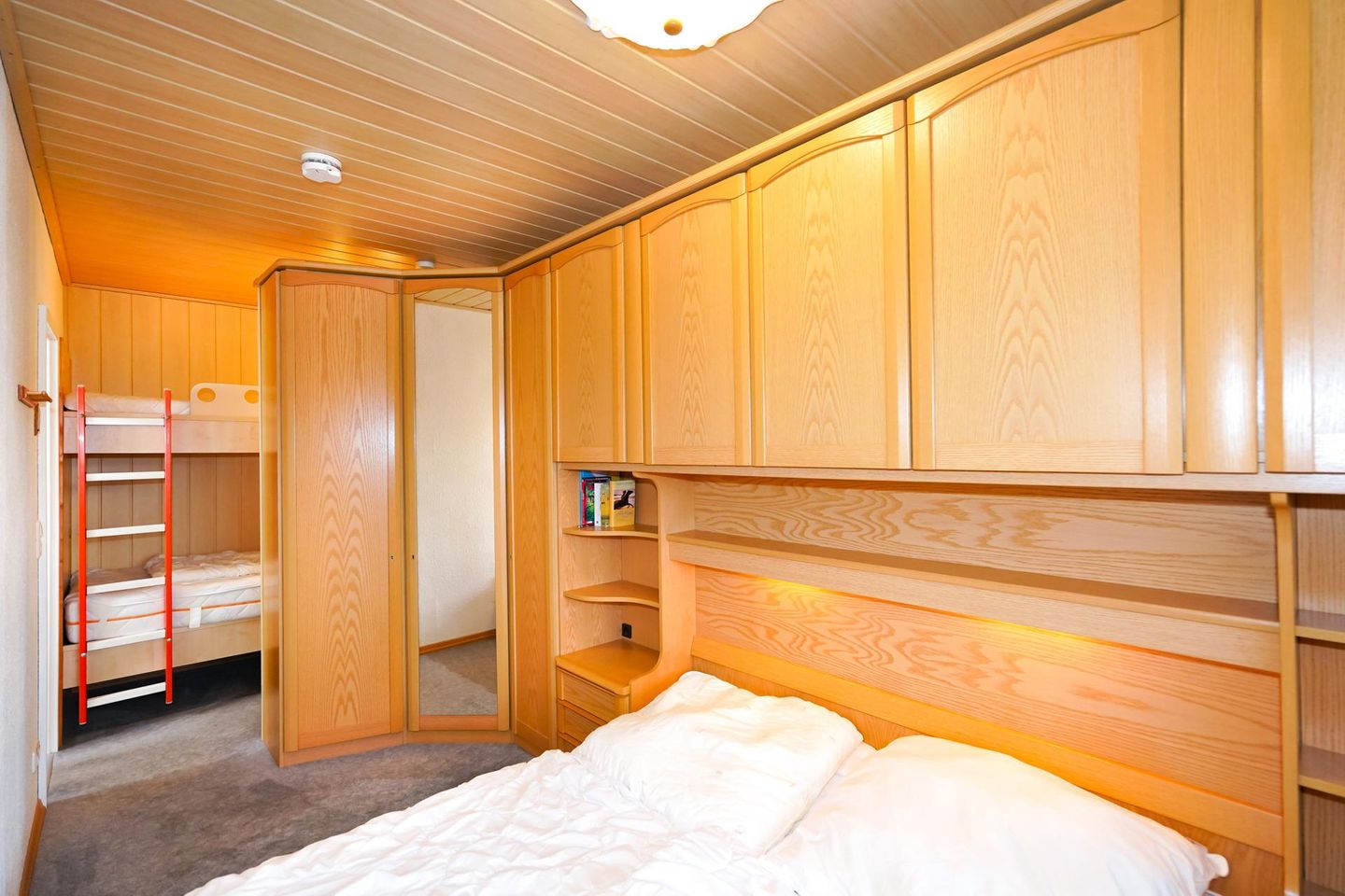Der Schlafraum wird über ein Fenster belüftet und bietet mit einem großen Doppelbett und einem zusätzlichen Etagenbett vier Schlafplätze. Der Bereich mit dem Etagenbett ist durch den großen Kleiderschrank teilweise abgeschirmt.